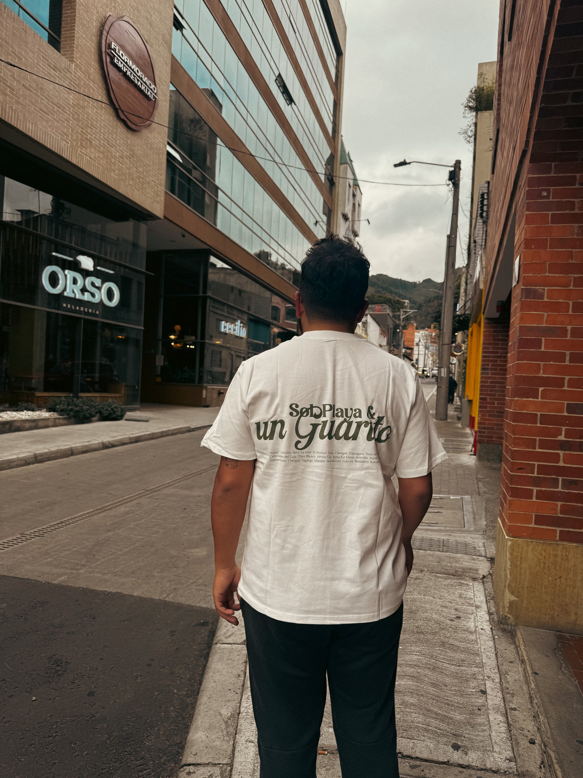 Esta camiseta es un viaje a nuestras costas en forma de prenda. Con un estampado trasero que grita Sol, Playa y un Guarito y un dibujo pequeño de playa en el pecho, es el símbolo del lado tropical del Colombian Dream. Oversized, ligera y confeccionada en algodón premium, es ideal para usar en climas cálidos, viajes con amigos o simplemente para traer un poco de Caribe a la ciudad. Disponible en verde, negro y blanco, es una pieza versátil que transmite frescura y alegría en cada look.